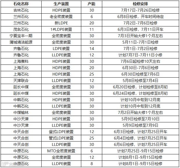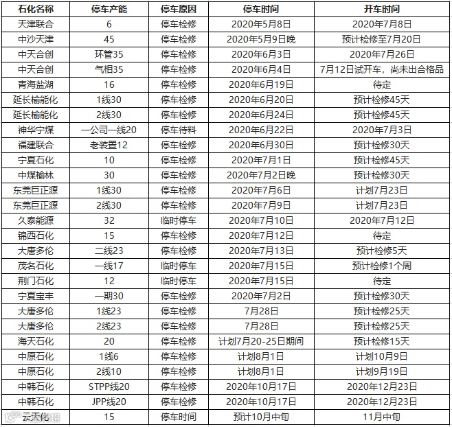 2020年第一、二季度聚丙烯因降负荷或停车导致损失量始终处于较高水平,2-6月检修损失量均在30万吨以上,主要原因为装置检修损失量均交去年同期有明显增长。7月份检修装置仍较集中,6、7月份为年内正常检查高点,国内聚丙烯供应经历年内最后一段压力较小的空窗期,8 月起停车将大幅减少。如果下半年临时及意外停车装置不多,检修对冲供应压力的空间将显著缩小。