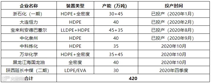 2020年,国内PE新增产能达420万吨,国内产能将达到2325.8万吨。据买化塑研究院跟踪的信息显示,投产产能主要集中于三季度,预计达275万吨。目前宝来利安德巴赛尔和中化泉州已出合格品,中科炼化、万华化学、黑龙江海国龙油正在试车,四季度还有延长中煤(二期)装置投产。在装置检修减少的情况下,四季度国内PE供应压力将显现。