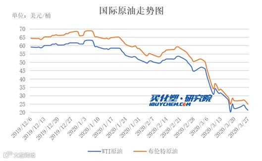 截至买化塑研究院发稿,WTI原油跌近7%报20.36美元/桶,最低价19.92美元/桶。布伦特原油跌近5%报27.05美元/桶,最低价26.56美元/桶。