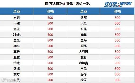 时至8月中旬,国内钛白粉市场再逢20余家钛企业发函调涨,截止至目前,广西顺风、金海钛业、贵州胜威、东方钛业、安徽安纳达、广西金茂、