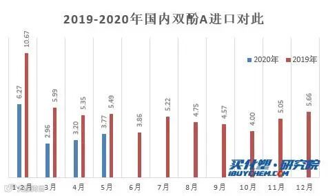 统计,2020年1-5月中国双酚A进口量总计16.20万吨,较2019年同期下降41.1%。2020年1-5月份,双酚A月平均进口量在3.2万吨,较去年平均水平下降1.8万吨。受疫情影响,韩国双酚A装置降负操作,同时受上一年进口量大增影响,2019年底之际美金合约商谈较往年大幅减少,故造成2020年上半年双酚A进口量大幅下降。