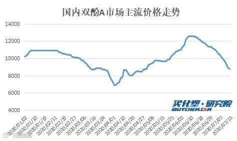 近期国内双酚A市场价格大幅下挫,原料苯酚、丙酮下跌与需求面低迷,双重利空之下价格不断走低,截止至7月15日,国内华东现货市场价格仅维持8700-8800元/吨。