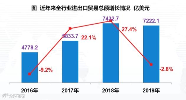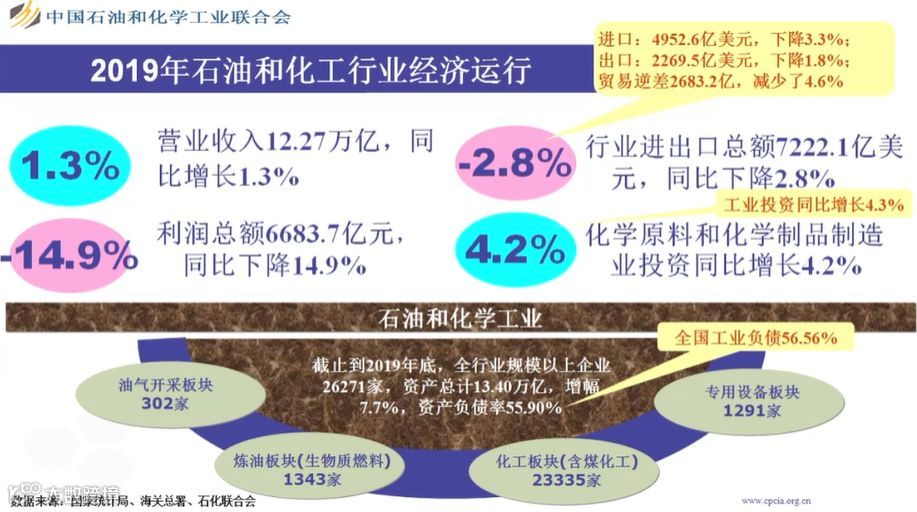 发布会。根据发布会报告显示,2019年,石油和化工行业营业收入12.3万亿元,同比增长1.3%,但利润总额6683.7亿元,同比下降14.9%;进出口总额7222.1亿美元,同比下降2.8%