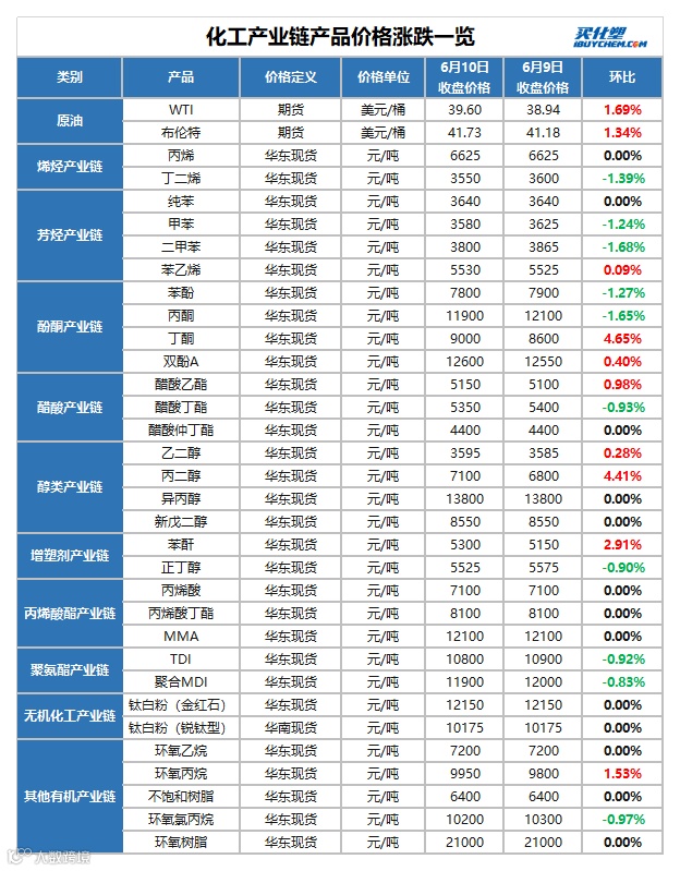 【原油】美国原油库存总量增加近800万桶,国际油价盘中下跌。但是在美联储宣布利率政策后,欧美原油期货市场气氛得到支撑,WTI涨至3月6日以来最高价位。周三(6月10日)纽约商品期货交易所西得克萨斯轻质原油2020年7月期货结算价每桶39.60美元,比前一交易日上涨0.66美元,涨幅1.7%;伦敦洲际交易所布伦特原油2020年8月期货结算价每桶41.73美元,比前一交易日上涨0.55美元,涨幅1.3%。