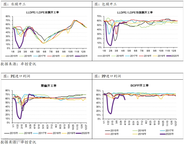 进入5月份,L下游农膜开工逐步走弱至年内低位水平,农膜对LLDPE和LDPE膜料的需求将逐步降低,包膜需求虽不及农膜季节性因素表现明显,但进入5月份后受经济下行压力影响需求端开工仍可能存有调降预期。PP需求方面,往年塑编5月份需求亦进入淡季,BOPP需求因行业协会提出BOPP减产目标致使BOPP5-6月份需求环比减少,注塑类需求因汽车、家电行业仍尚未完全恢复而不必抱有较大预期。当前国外韩国、欧洲地区正着手准备开启复工复产,不排除来自海外的塑料制品出口订单接踵而至。