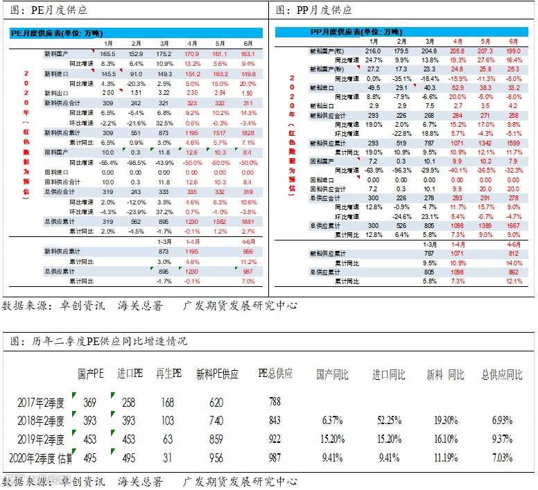 从PE新料来看,二季度累积供应同比增速11.2%,增速虽不及2018、2019年同期,但增速仍较高。从PE总供应来看,二季度累积供应同比增速7.03%,增速与2018、2019年同期相差并不太大。