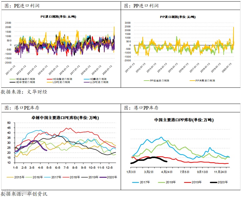 4月中旬以来,受口罩激增需求带动,国内L和PP现货价格大幅上涨,较高幅度升水外盘美金价格,给予进口商较大空间的进口利润,其中4月份LLDPE、LDPE、HDPE注塑、HDPE膜料、HDPE中空、HDPE拉丝等PE料的进口利润平均为261元/吨、679元/吨、125元/吨、881元/吨、708元/吨,1013元/吨。