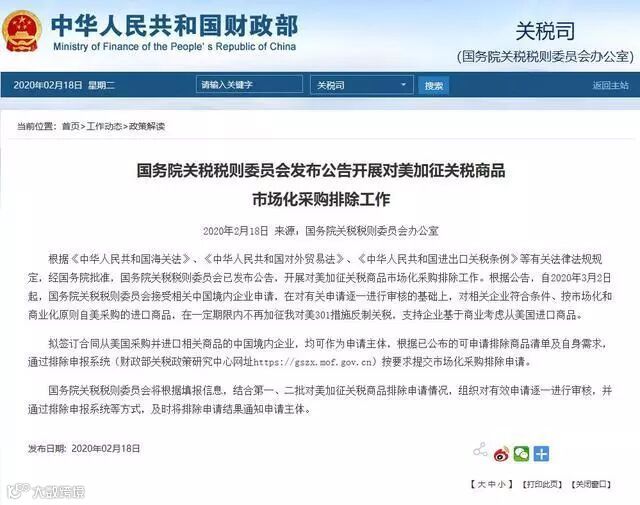国务院关税税则委员会办公室2月18日下发通知,2020年3月2日起,国务院关税税则委员会接受相关中国境内企业申请,在对有关申请逐一进行审核的基础上,对相关企业符合条件、按市场化和商业化原则自美采购的进口商品,在一定期限内不再加征我对美301措施反制关税,支持企业基于商业考虑从