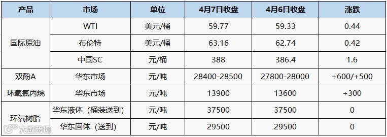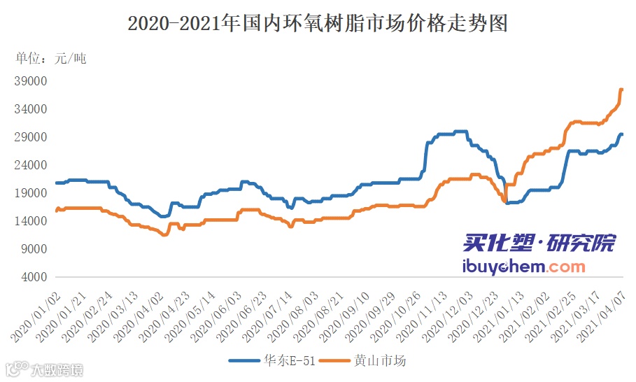 在双原料持续上涨带动,以及环保严峻形势供应偏紧下,国内环氧树脂节后返市已持续上行,各大厂商拉涨积极,业者对市看涨心态明显,目前,部分企业已封单不报。截止至4月8日,山东环氧树脂市场主流商谈价格参考在30500-31000元/吨;黄山固体环氧树脂市场主流商谈价格参考在31000元/吨左右;华东液体环氧树脂市场主流商谈价格参考在38000-38500元/吨桶装出厂。