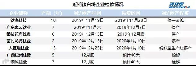 有消息称华南地区广西部分钛白粉企业将于12月末停产检修,将持续40天左右,据市场人士透露江西添光也已停产。西南、华南地区多数检修厂家恢复