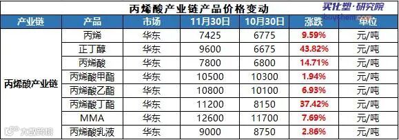 十一月,丙烯酸及酯随着原料丙烯步伐,市场价格强势拉涨,其中丙烯酸丁酯涨势最为强势,截止至11月底价格最高涨至11500元/吨,创下近两年来最高点。丙烯酸相关产业链产品丙烯酸酯、MMA、丙烯酸乳液、正丁醇等产品悉数同步联涨。