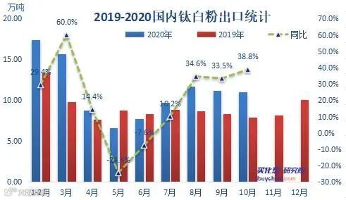 显示,10月我国钛白粉出口量约11.02万吨,同比增长38.84%,1-10月钛白粉累计出口量约99.98万吨,同比增长21.81%。由数据可见,2020年1-10月钛白粉总出口量基本达到2019年全年水平(2019年出口量为100.27万吨)。当前在全球疫情形势下,钛白粉出口再次创造历史新高,预计2020年出口总量或将超过120万吨。