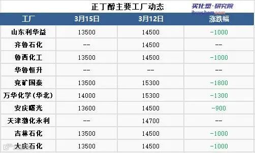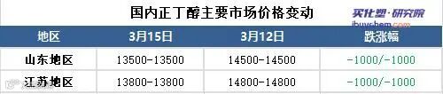 3月15日,国内正丁醇市场价格大跌,各地区主力工厂出厂价下调900-1800元/吨,山东及华东地区市场价格跟随下调,目前,正丁醇工厂价格普遍在13500-13600元/吨,市场价在13500-13800元/吨,较上周末跌1000元/吨。