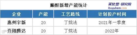 2021年,惠州宇新计划投产20万吨新装置投产,齐翔腾达新装置预计将于2022年投产,来自供应端的扩张压力必将对国内顺酐市场运行造成冲击。
