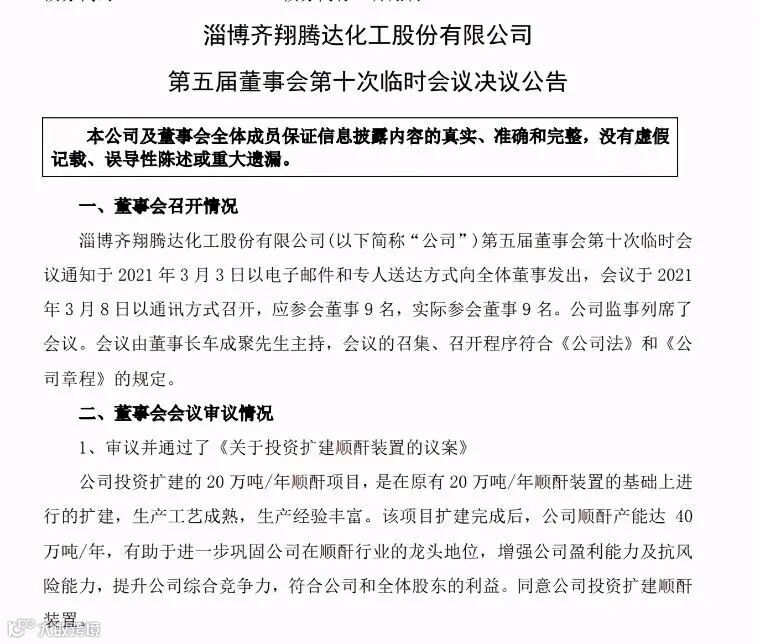 近日齐翔腾达发布公告称,将投资13.5亿元扩建20万吨/年顺酐项目,在原有20万吨/年顺酐装置的基础上进行的扩建,预计建设周期18个月,该项目扩建完成后,齐翔腾达顺酐产能达40万吨/年。