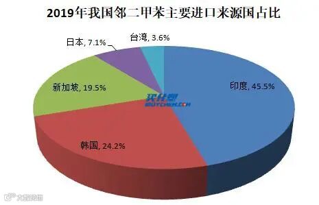 从2019年进口数据来看,我国邻二甲苯主要进口来源国及地区基本集中在亚洲国家,其中印度占比最大,占进口总量的45%;韩国为第二大进口来源国,占进口总量的24%左右;