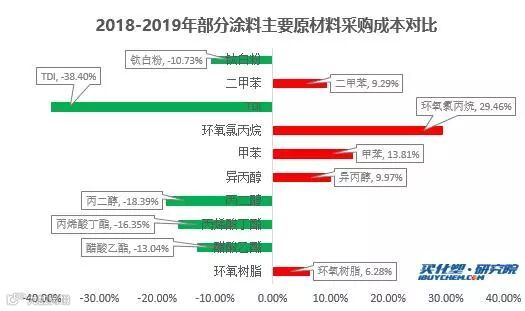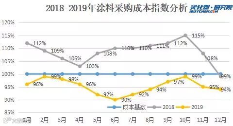 2019年,国内涂料采购成本相比2018年总体出现下滑,据买化塑研究院涂料采购成本指数显示,2019年12月指数为94%,环比下滑1个百分点,较2018年12月同比下滑5个百分点。随着钛白粉、TDI等涂料主要原材料价格的大幅下跌带动涂料采购成本指数下滑。以TDI为例,2018年12月均价17695.24元/吨,而到2019年12月价格仅在11000元/吨,跌幅高达为38%。