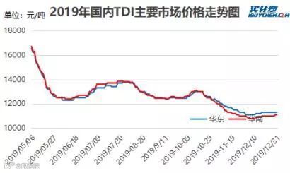 2019年国内TDI市场价格整体下滑,截止至12月年内价格已由17000元/吨下滑至11000元/吨关口,年内随着万化及连石投产,国内TDI有效产能跃升至119万吨,于此同时产量也大幅提升。现货市场供应量有增无减,而下游涂料等产业受房地产、家具等行业的萎缩,需求下滑,市场价格持续松动。