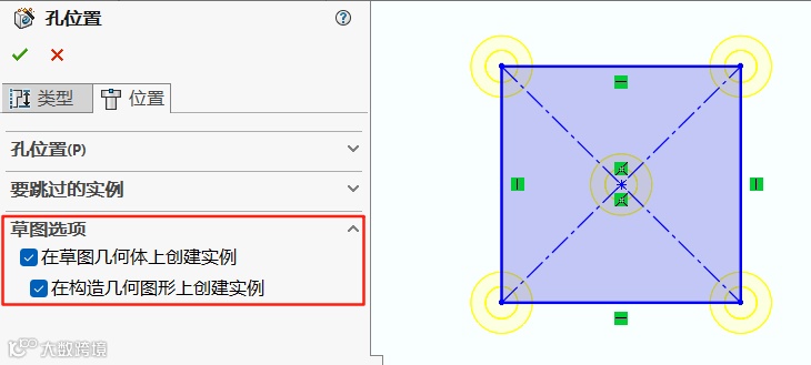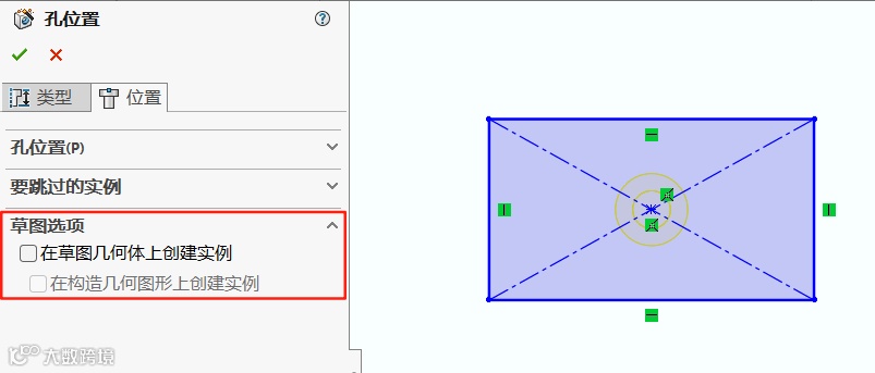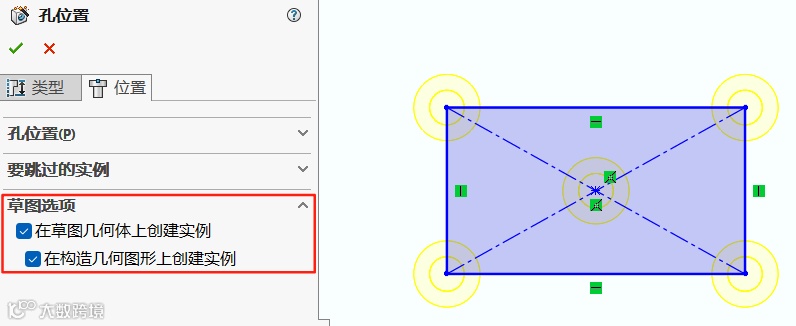 2.在草图选项设置中选择在草图几何体上创建实例及在构造几何图形上创建实例选项。