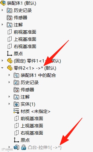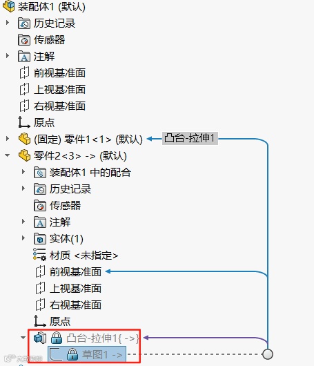 此时的装配体设计树中可看到,带有外部参考的零部件特征也已冻结。