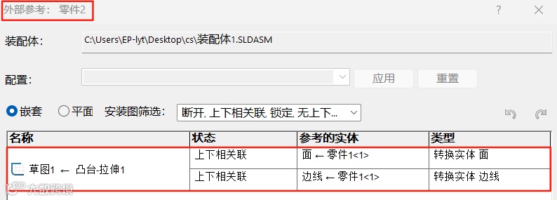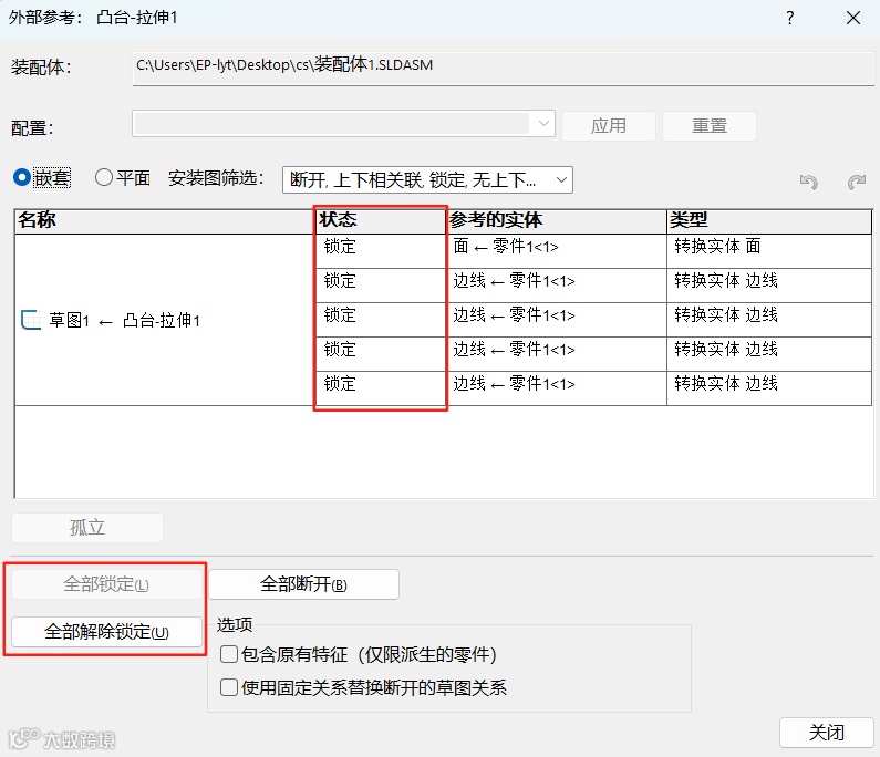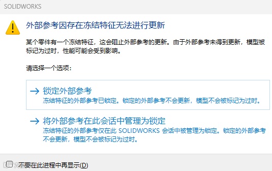 在消息中,您可以选择锁定外部参考,或仅在当前会话中对其临时锁定。这样SOLIDWORKS就不会更新锁定的外部参考,模型也不会被标记为过时。