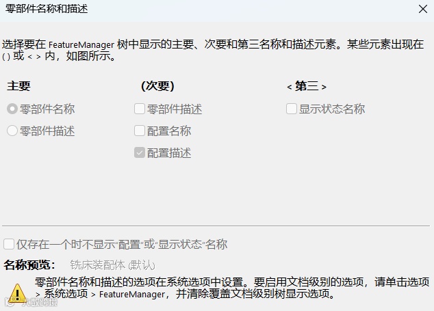您可以使用覆盖文档级别树显示在系统级别的零部件名称和描述对话框中指定选项。启用后,系统级别选项会覆盖FeatureManager设计树中零部件名称的文档级别选项。系统级别选项不会覆盖文档中的文档级别选项。
