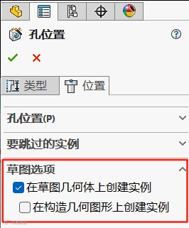 在异型孔向导位置选项卡上,此功能适用于以下选项:在草图几何图形上创建实例以及在构造几何图形上创建实例。