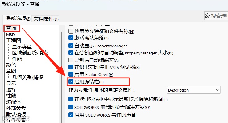 a)在系统选项中,确认启动冻结栏是否有开启,未开启则无法冻结特征。