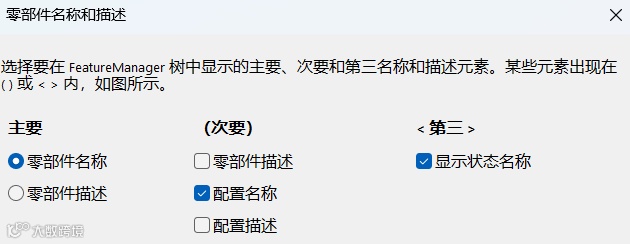 例如,在主要下,选择零部件描述。在次要下,清除配置名称并选择配置描述。在第三下,清除显示状态名称。