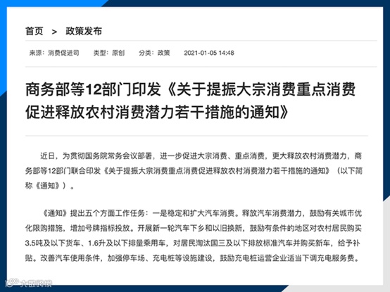此前11月18日国务院常务会议曾指出,今年消费遭受疫情严重冲击,恢复正常增长有不少困难。要按照党中央、国务院部署,实施扩大内需战略,进一步促进消费。一要扩大汽车消费。鼓励各地增加号牌指标投放。开展新一轮汽车下乡和以旧换新,鼓励有条件的地区对农村居民购买3.5吨及以下货车、1.6升及以下排量乘用车,对居民淘汰国三及以下排放标准汽车并购买新车,给予补贴。二要促进家电家具家装消费。鼓励地方对淘汰旧家电家具并购买绿色智能家电、环保家具给予补贴。三要提振餐饮消费。鼓励餐饮企业提升菜品、创新经营。支持推介优质特色饮食。四要以扩大县域乡镇消费为抓手带动农村消费。加强县域乡镇商贸设施和到村物流站点建设。打击假冒伪劣,优化农村消费环境。