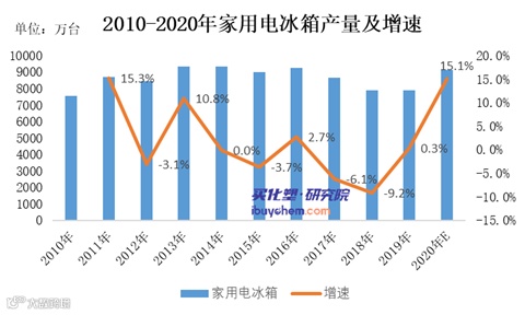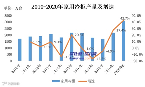 虽然汽车产销量增速出现下滑,但家电产量出现明显增长。据买化塑研究院【化塑产业链决策系统】跟踪的数据显示,2020年家用电冰箱产量预计为9100万台,同比增长15.1%。