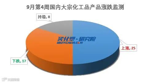本周国内化工市场依然处于“金九”传统旺季中,市场需求继续恢复,在“金九银十”传统旺季带动下,化工品市场仍表现为持续涨势。据买化塑研究院监测的50种大宗化工品数据显示,本周上涨品种25个,下跌品种17个,持平产品8个