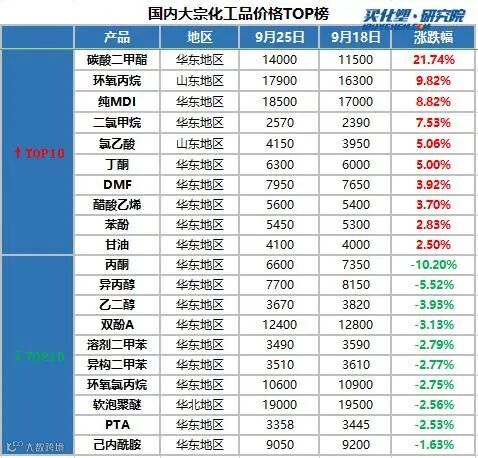 。本周涨幅前三产品分别碳酸二甲酯、环氧丙烷、纯MDI,涨幅分别为21.74%、9.82%、8.82%;