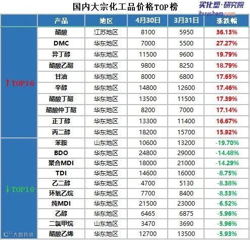 4月,在国内内需恢复不断巩固增强叠加出口订单回流等因素影响下,化工品市场行情仍显强势。经济环境向好的同时,国内大宗化工品价格也持续攀升,据数据显示超半数以上化工品价格较上月均出现不用程度上涨。