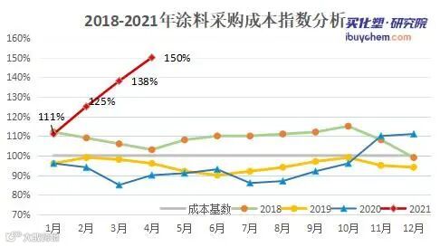 文章摘要:2021年4月指数为150%,环比及同比均出现大幅上涨,涂料主要原材料钛白粉、环氧树脂、丙二醇、醋酸乙酯、正丁醇等悉数上涨