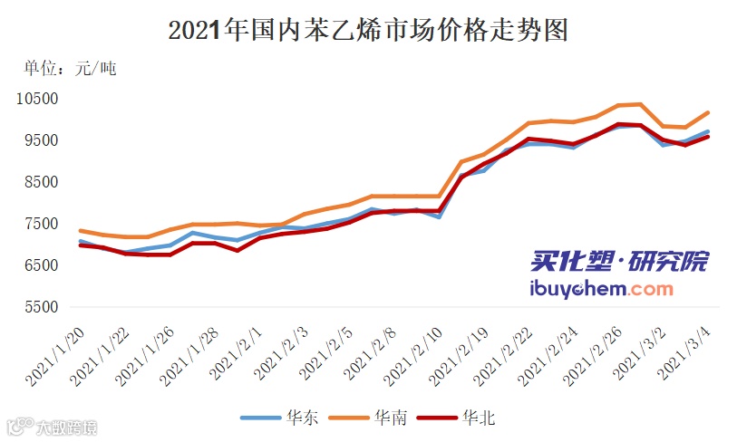 数据显示,近13年两会期间华东苯乙烯上涨概率在69.23%,较两会前一个月上涨概率提升7.69%,但整体涨跌幅度较两会前一个月有收窄。数据看,虽两会期间华东苯乙烯市场震荡幅度有缩减,但缩减有限。两会期间苯乙烯市场震荡幅度仍较大。历届两会之后一个月,华东苯乙烯市场上行概率进一步提升,至76.92%,两会后一个月时间整体上涨幅度较两会前一个月及两会期间涨幅多有小幅提升。近期国内苯乙烯市场走势如下图: