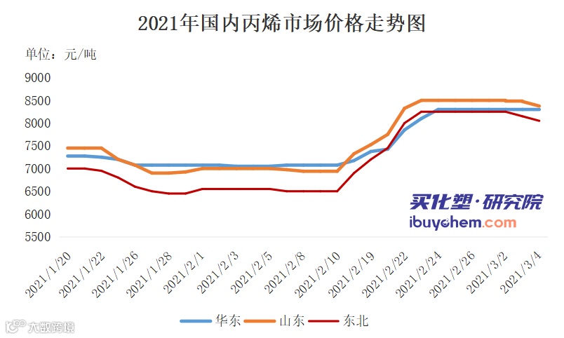 数据显示,两会前后丙烯市场多呈现上涨趋势,而两会期间丙烯行情多呈现下跌趋势。近11年两会期间丙烯价格下跌概率高达63.63%。而在两会之后,国内市场上行概率较大。两会结束后,危险品运输受限解除,外围货源流通量恢复正常。加之两会期间下游库存消耗至低位,对原料需求会出现阶段性回升。近期丙烯走势如下图: