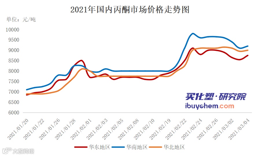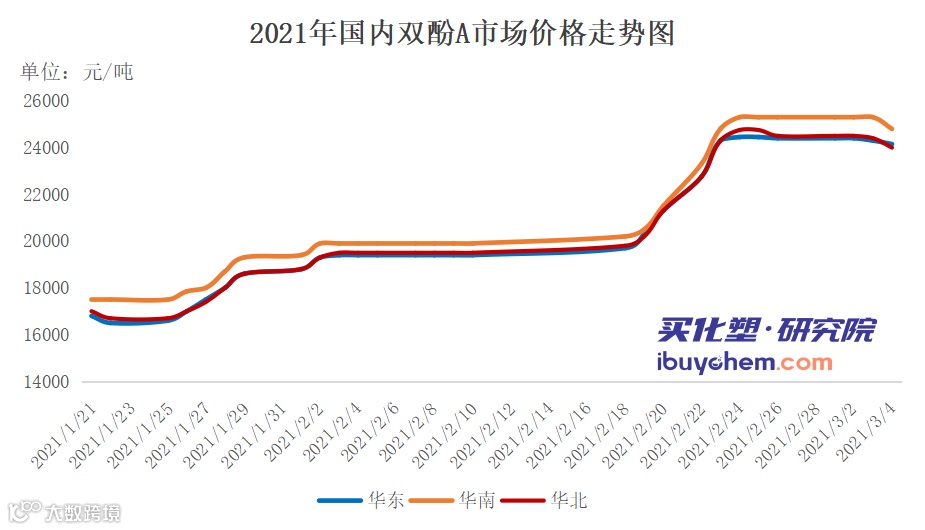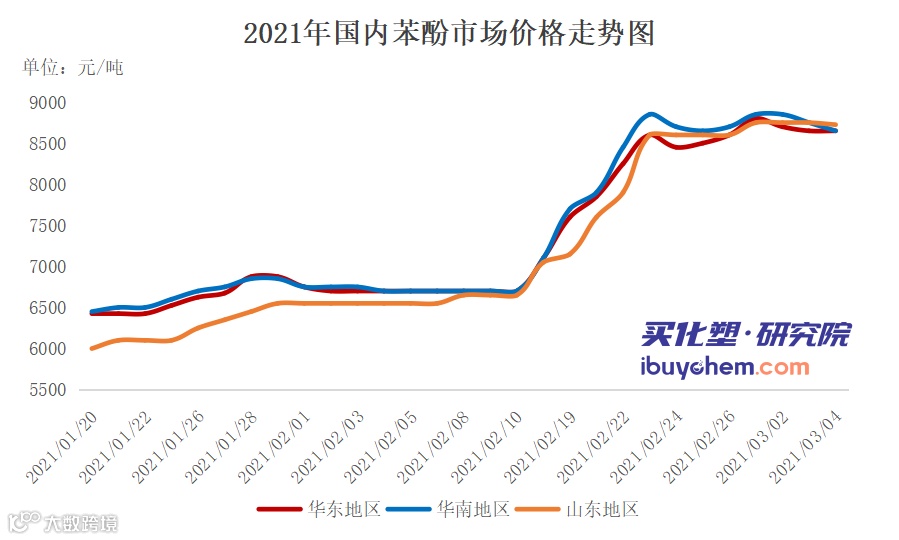 数据显示,近13年两会期间苯酚价格下跌概率明显大于上涨概率,下跌概率近77%。而两会前一个月市场价格上涨的概率近86%,2013年及2017年除外。2009年涨幅超过30%,2021年涨幅接近30%,此阶段的涨势与2009年有相似之处,但又不尽相同,成本面快随推高最先给予市场向好预期,此外,进口船货延迟到港、转口及提前销售等操作,导致现货供应偏紧,供方无出货压力,重心快速上扬。两会结束后,市场上行的概率较大,据13年的数据显示,上涨概率在69%附近。近期苯酚价格走势如下图: