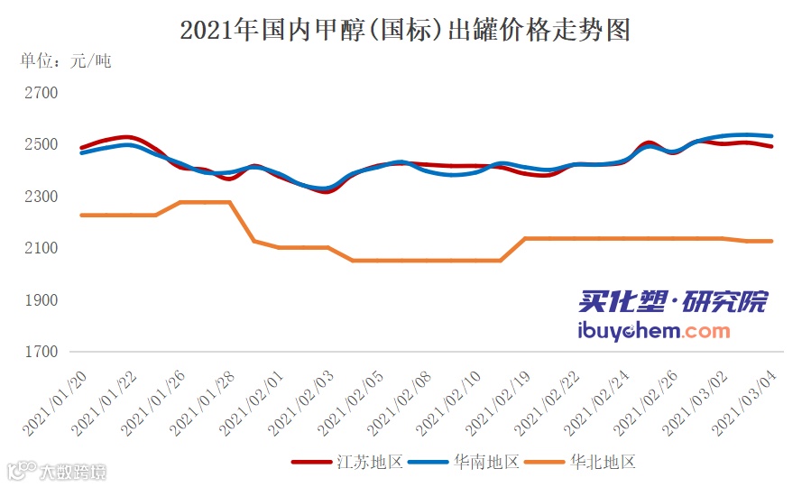 数据显示,近16年来两会期间甲醇市场依旧以下跌为主,下跌概率69%,除2013、2014年以外,江苏太仓价格跌幅往往维持在7%以下。两会前一个月,市场仍以下跌为主,下跌概率高达68.8%,尤其是2018年跌幅超过16%。而两会之后,市场上涨概率大。近16年来,有9个年份是上涨态势,上涨概率56.3%。由此可看出,两会前后的市场往往处于先空后多的窗口期。近期甲醇走势如下图: