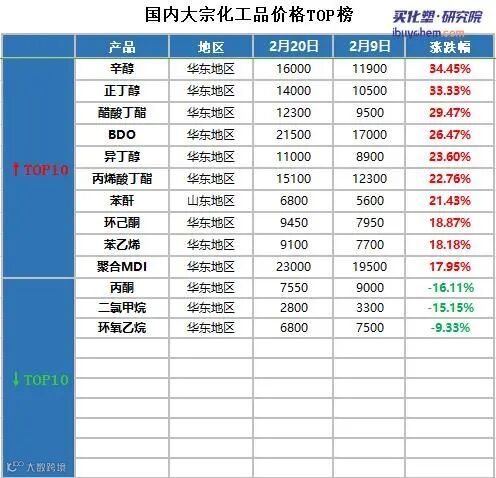 辛醇:辛醇市场节后三日内平均日涨幅达到2000元/吨。增塑剂生产企业春节期间不仅未有因减产停车造成的负荷明显下降,由于内外需订单充裕,多高负荷保持生产运转,对辛醇需求量不降反有大增,春节后开市出现集中采买局面,辛醇供应短缺局面随即加剧,下游补货积极性较高,市场连日暴涨,截止至当前华东市场价格调涨至16000元/吨。