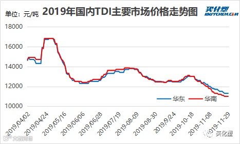 11月国内TDI市场弱势阴跌,月底华东地区国产货带票出库价收于10800-10900元/吨,较上月底下跌1500-1600元/吨,