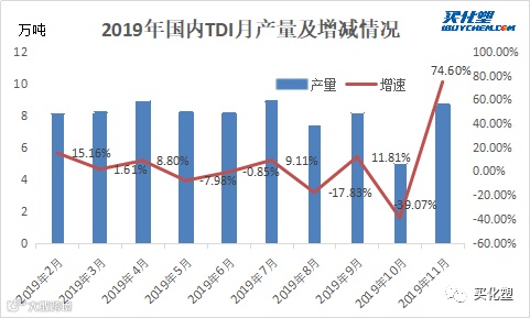 11月国内TDI月产量约为8.66万吨,平均开工率83%,伴随沧化大化5万吨技改成功,预计12月TDI开工率增至90%以上。