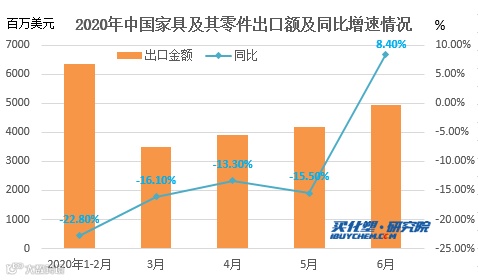 从出口情况来看:2020年6月中国家具及其零件出口金额增长,2020年6月中国家具及其零件出口金额为4934百万美元,同比增长8.4%。
