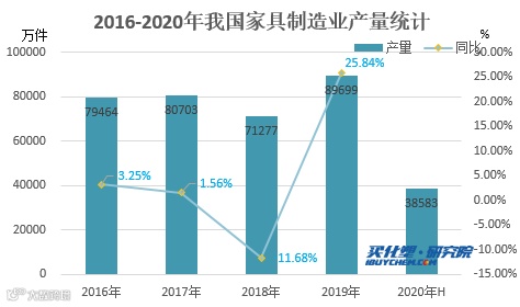 据统计数据显示,2020年1-6月,全国家具制造业产量38583.4万件,同比下降11.7%。其中,1-5月期间,国内家具制造业产量同比均出现不同程度下滑,直至6月,全国家具制造业产量7764.9万件,同比才出现小幅增长,涨幅为3.2%。