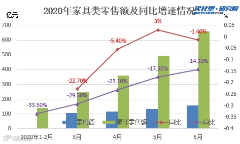 逐年下降。从零售情况来看,国家统计局数据显示,2020年6月全国家具类零售额达为159亿元,与去年同期相比下降1.4%。1-6月份,全国家具类零售额达为657亿元,与去年同期相比下降14.1%。