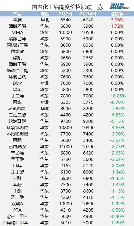 导读:本周苯胺较上周涨3.06%、醋酸乙酯较上周涨1.72%;丁二烯较上周跌10.26%、丙烯较上周跌8.70%、环氧丙烷较上周跌7.87%。