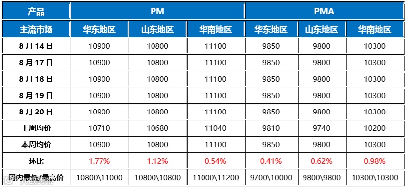 表 1 本周PM/PMA国内主流市场价格对比