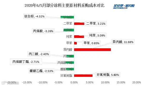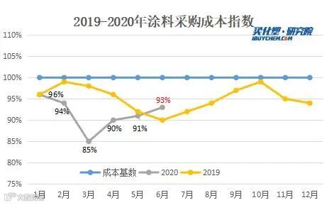 据买化塑研究院涂料采购成本指数显示,2020年6月指数为93%,环比上升2个百分点,其中涂料主要原材料如环氧树脂、异丙醇、二甲苯等产品月均价环比依然上涨,其中异丙醇6月均价环比涨11.68%、环氧树脂较上月环比涨5.8%;但钛白粉、丙烯酸丁酯等产品价格出现下滑。