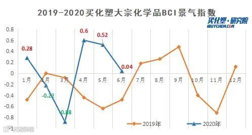 据买化塑研究院监测,6月BCI大宗化工品景气指数为+0.04,依然保持正值。从具体数据来看,本月25种大宗化工品价格价格依然保持上涨,但下跌产品数量较5月有所增多,这表明国内对外出口贸易增长预期短期难言预料,对化工品需求造成的利空压力短期内将仍有延续。尤其原油期货走势大幅震荡,围绕40美元价格上下宽幅波动,表明投资者对于经济复苏以及疫情形势的极端不确定性。
