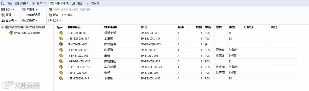 SOLIDWORKS PDM提供了强大的版本控制功能,用户不仅可以查看当前版本的BOM表,还可以追溯历史版本的BOM表,了解零件或装配体的变更记录。SOLIDWORKS总装配体的设计过程中,其底下装配的子装配体与零部件较多。使用SOLIDWORKS PDM的工程师可以通过SOLIDWORKS PDM系统查看总装配体的材料明细表,PDM根据用户需求配置材料明细表表头所显示的变量属性来查看总装配体的材料明细表。